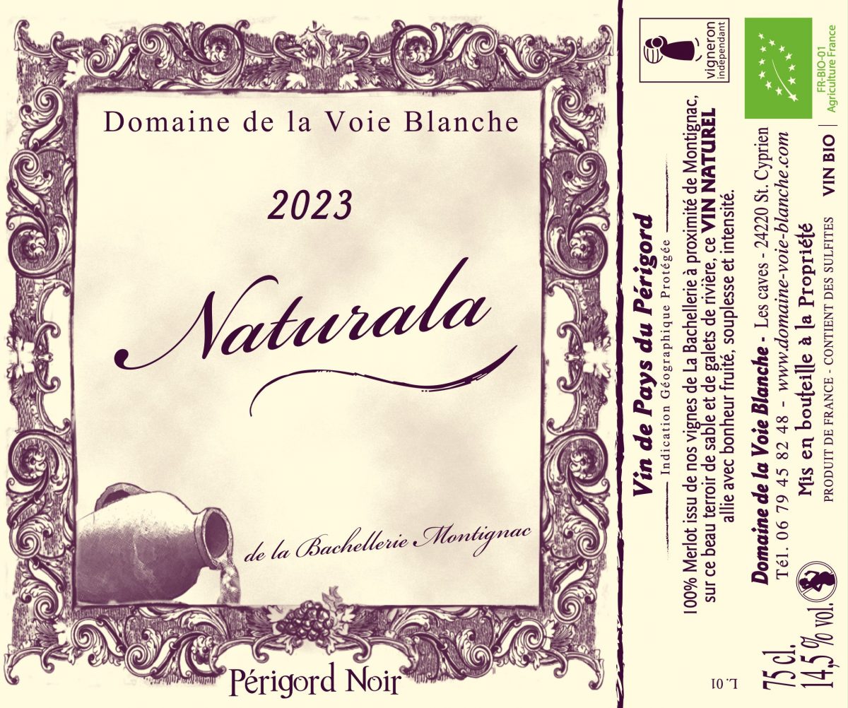 100% merlot, Naturala est issu des terroirs de La Bachellerie à proximité de Montignac, sur un terroir argilo-sableux, très bien exposé et riche de tous les minéraux. Avec seulement 19mg de sulfite par litre, Naturala conviendra aux personnes qui recherchent des vins très peu sulfités. Sa structure ferme et franche est accompagnée d’un fruit souple, floral, qualitatif grâce au tri sérieux de nos vendanges manuelles.